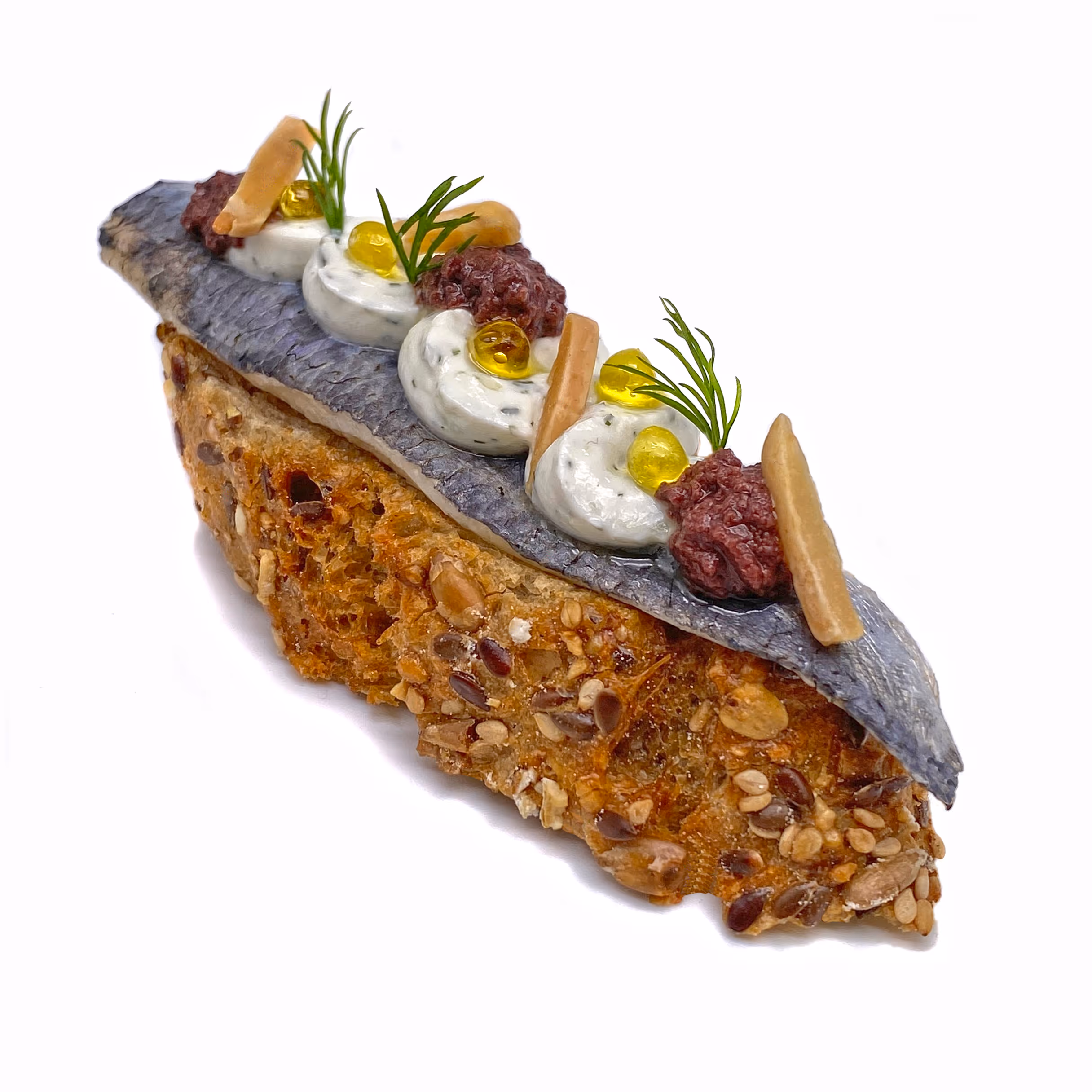 Sardina marinada en vinagre, tzatziki, olivada d'empeltre i pa de cereals