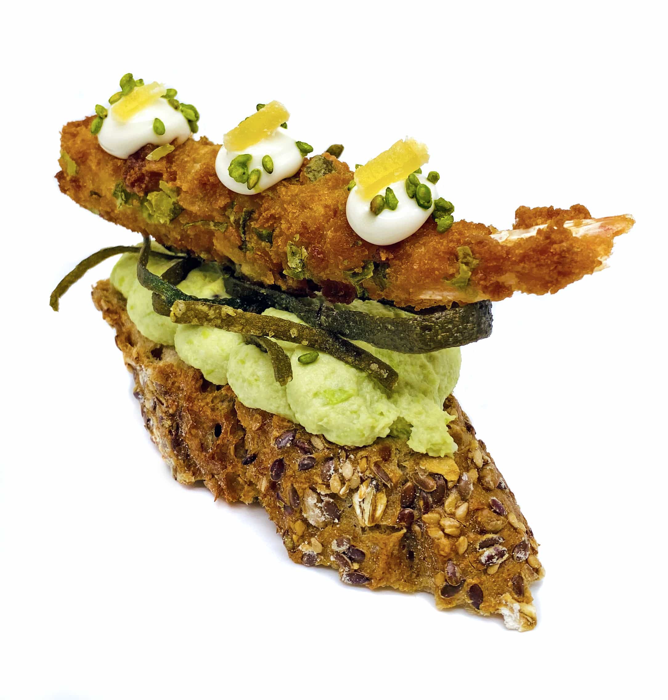Croquetón de pollo estofado, mayomiso y boniato crujiente