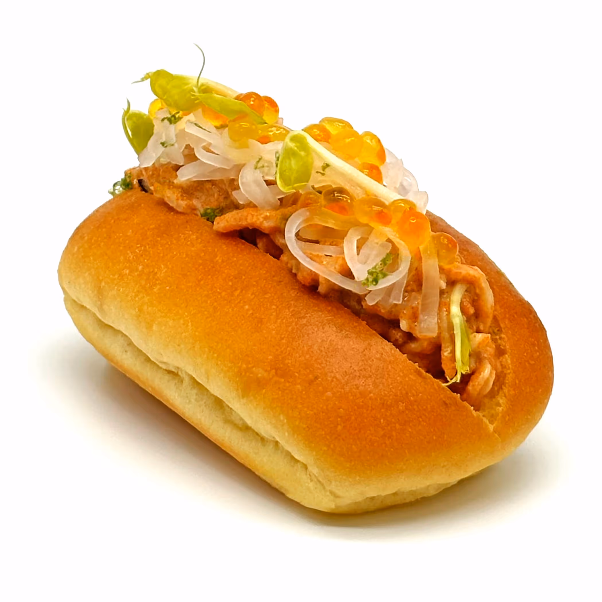 Pan Brioche, farsa de txangurro, daikon encurtido y perlas de salmón.