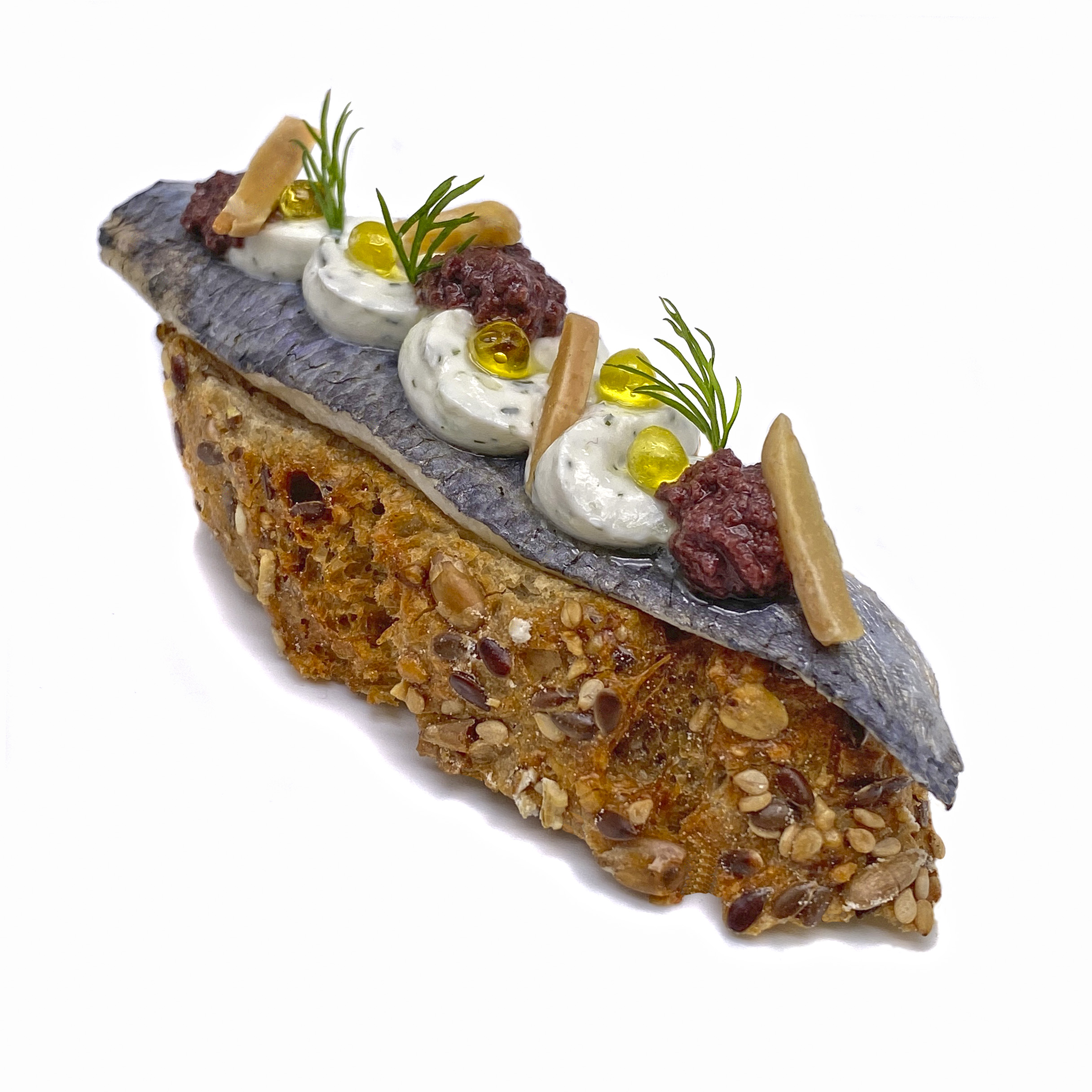 Sardina marinada en vinagre, tzatziki, olivada de empeltre y pan de cereales