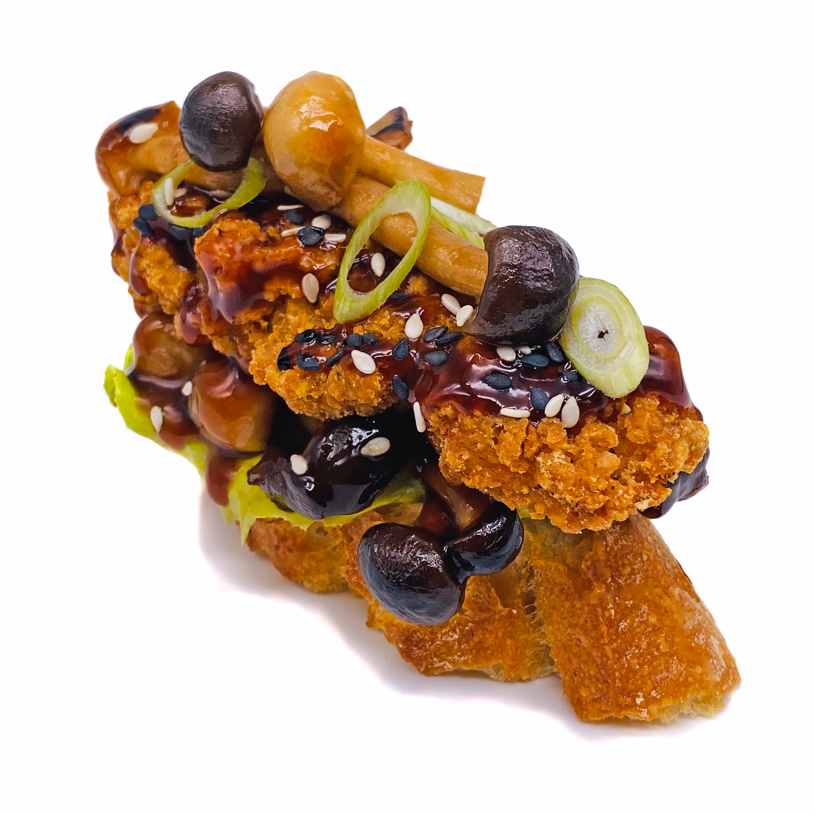 Pollo crujiente, setas y salsa BBQ estilo coreano.