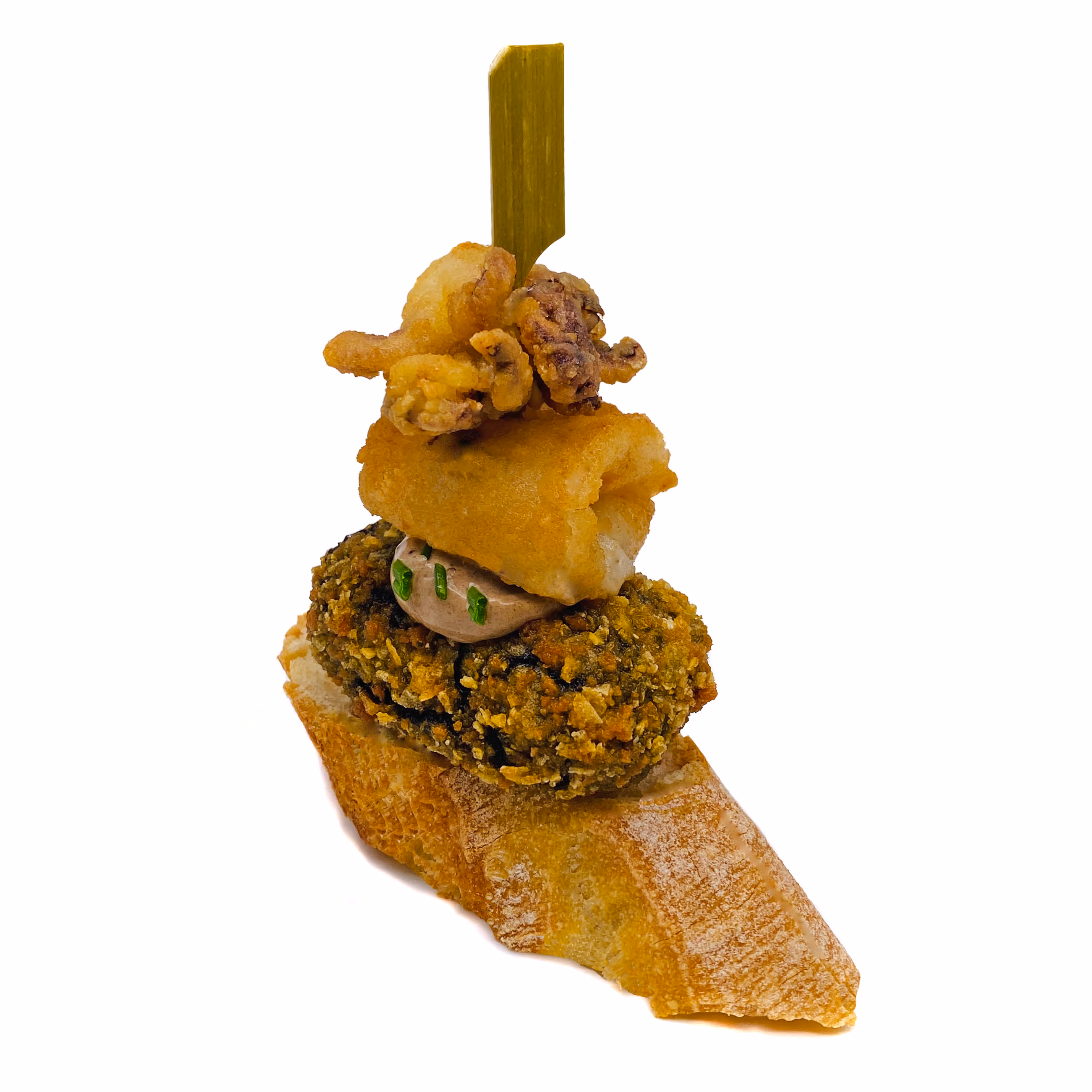 Croquetón de pollo estofado, mayomiso y boniato crujiente