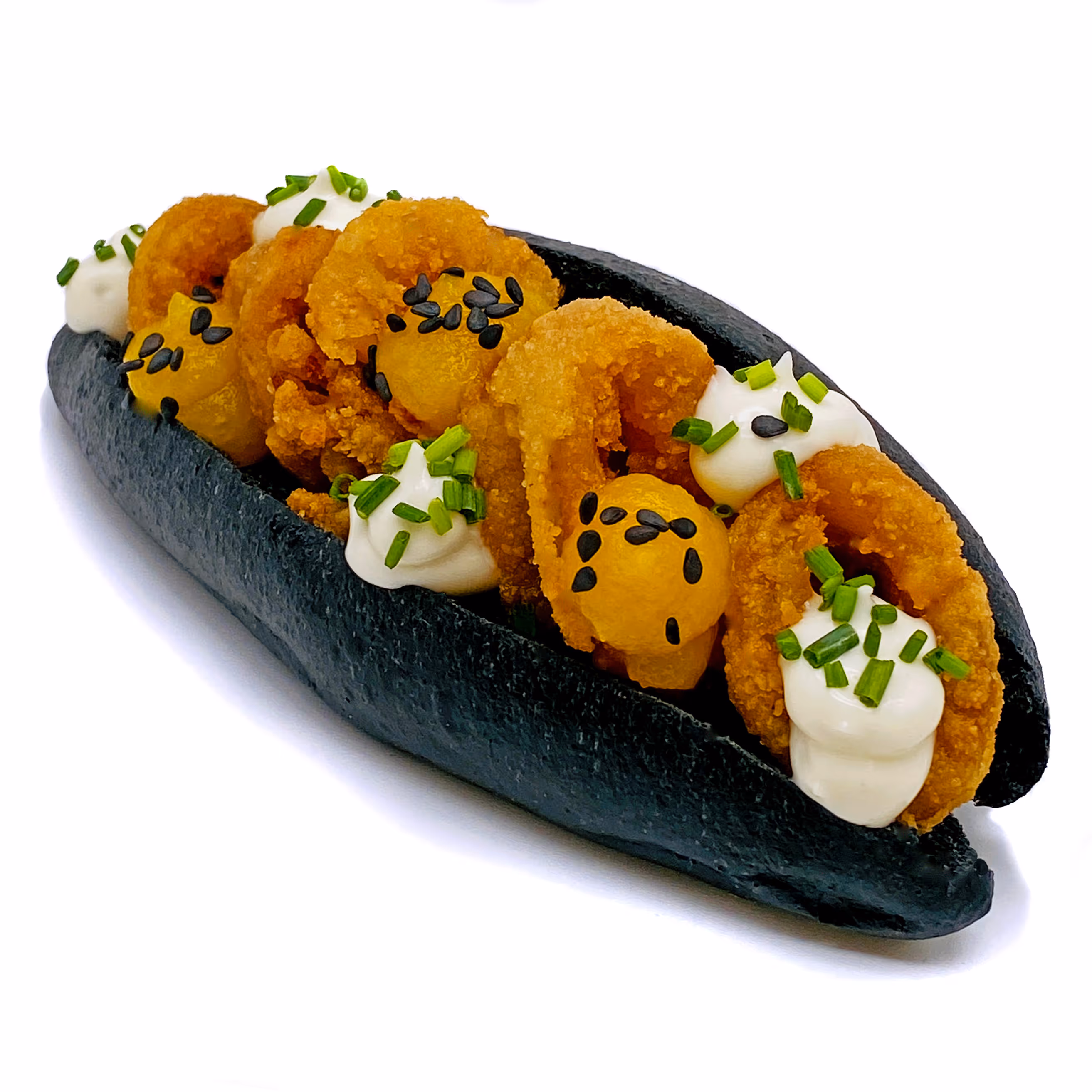 Croqueta de chipirones en su tinta y allioli de ajo negro.